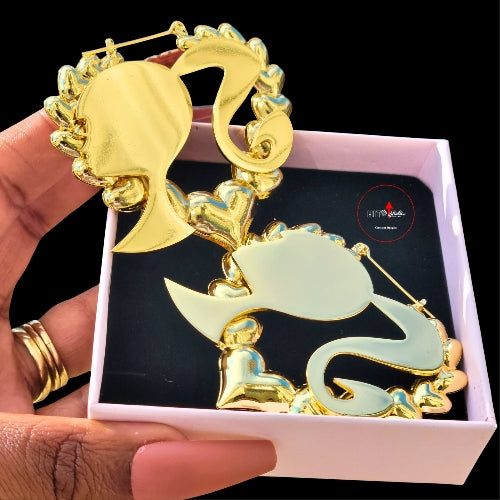 Introducing our stunning Barbie Gold Plated Heart-Shaped Personalized Name Plate Earrings! These custom made to order earrings are the perfect accessory for any occasion, whether it's a night out with friends or a special event. The heart-shaped design adds a touch of romance to your outfit, while the gold plating gives a luxurious feel. The Barbie's head adds a unique touch, making these earrings truly one-of-a-kind. These earrings are sure to turn heads and make a statement wherever you go. Order yours today!