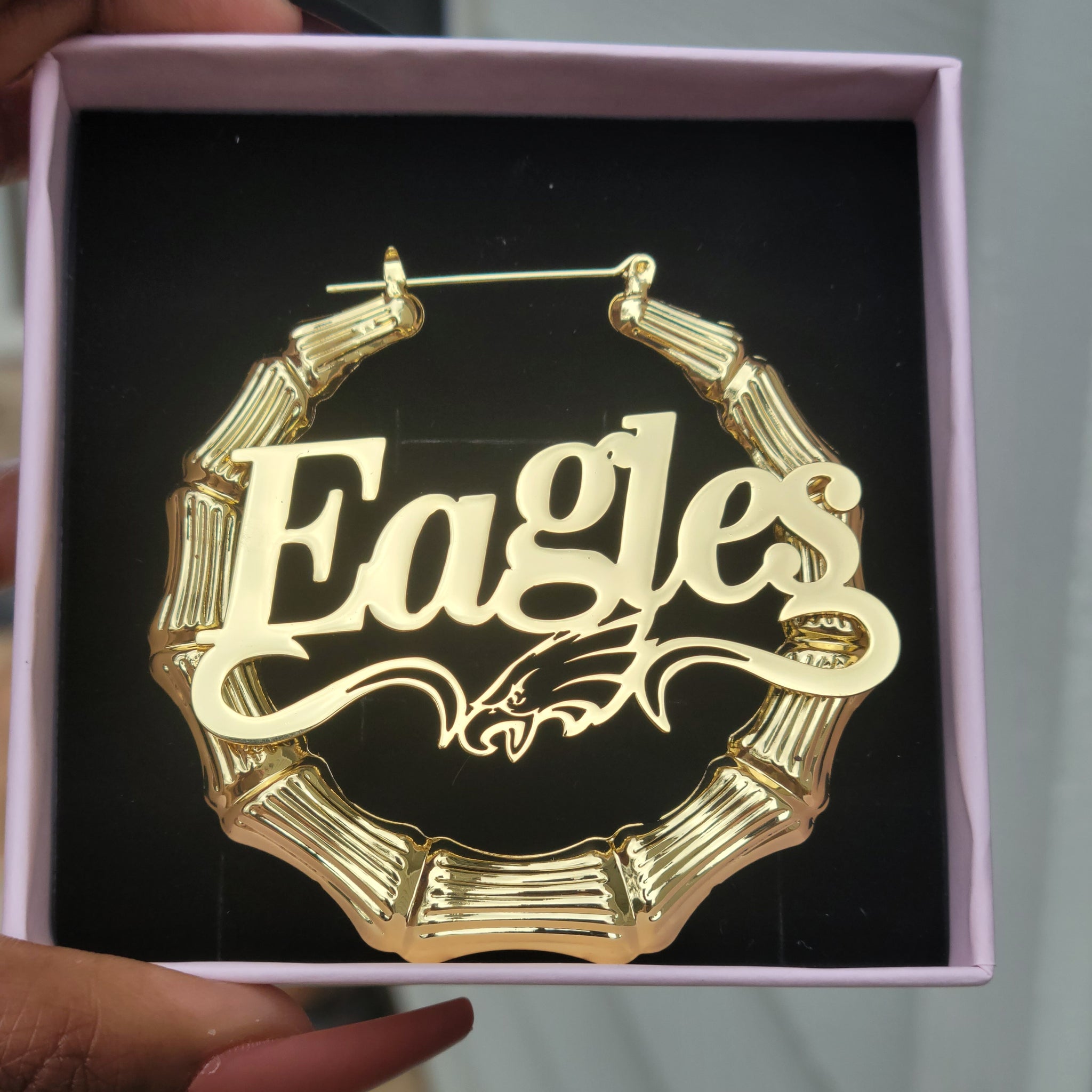 Indulge in the ultimate luxury with our "EAGLES" Custom Personalized Earrings. Crafted from 18k gold-plated bamboo, these earrings can be uniquely designed to showcase your love for Philadelphia Eagles football team. Make a statement and add a touch of sophistication to any outfit with our exclusive, one-of-a-kind earrings.