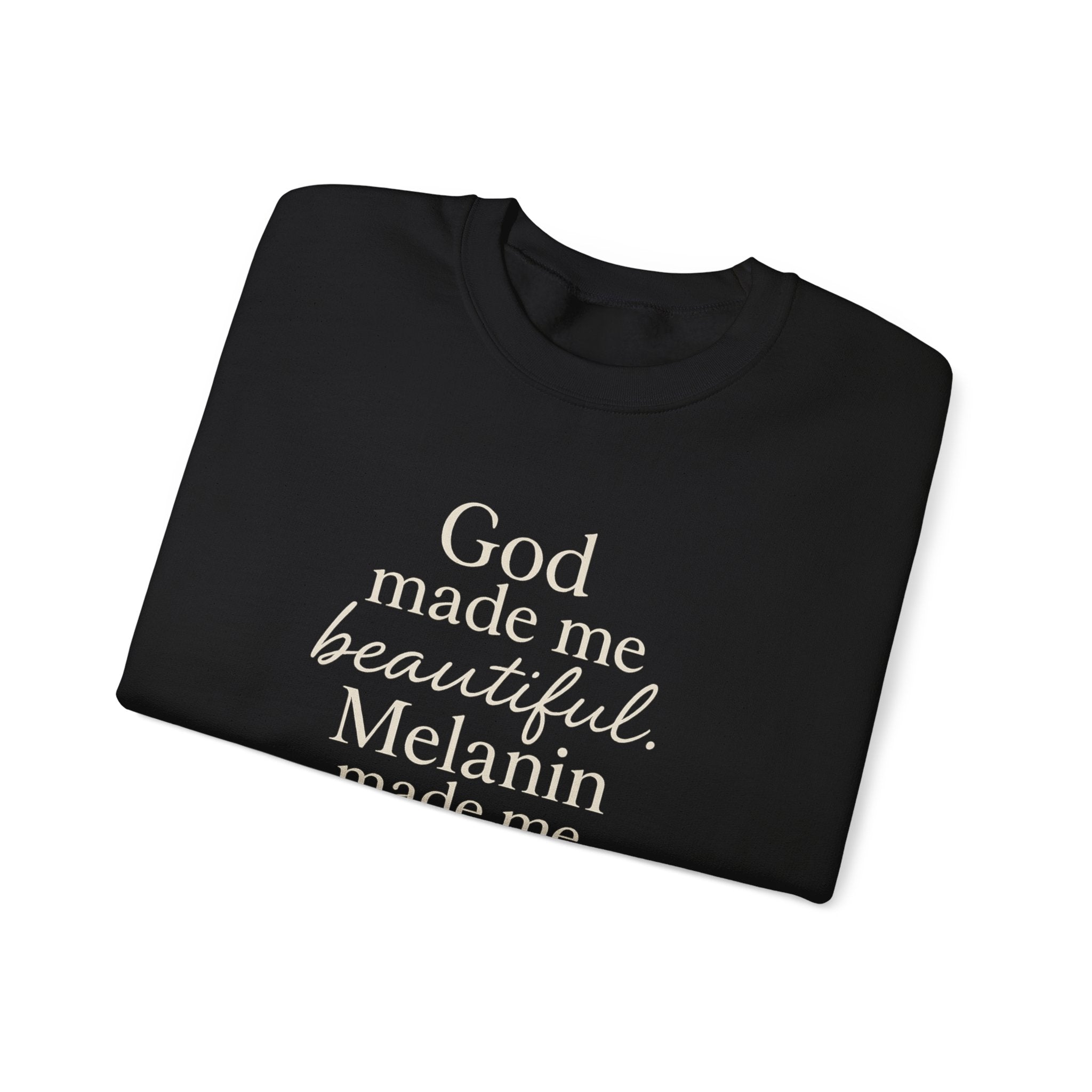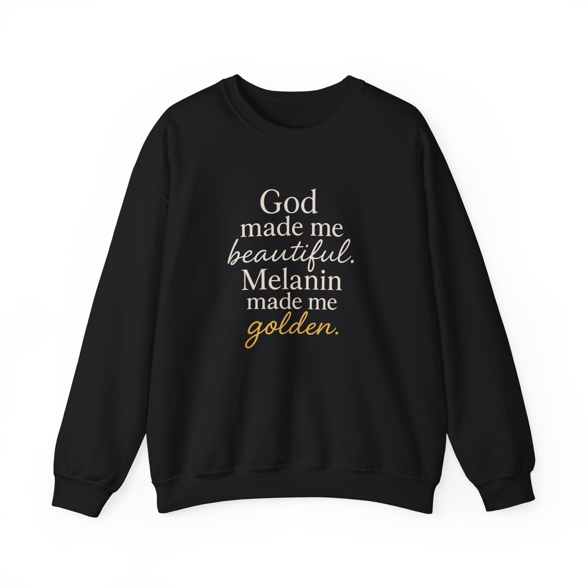 This unisex heavy blend crewneck sweatshirt features the uplifting message 'God Made Me Beautiful, Melanin Made Me Golden. Perfect for anyone looking for comfort, style, and a positive affirmation. Ideal for adults looking to express self-love and confidence. Great for celebrations like Black History Month, International Women's Day, and any day you want to spread positivity.